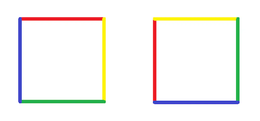 Imagine, for example, that you have two square pillows. The first is red on top, yellow on the right, green on bottom and blue on the left. The second is yellow on the top, green on the right, blue on bottom, and red on the left. The pillows aren’t exactly the same. One has a red top, while one has a yellow top. But they’re certainly similar. In fact, they would be exactly the same if you turned the pillow with the red top once counterclockwise.